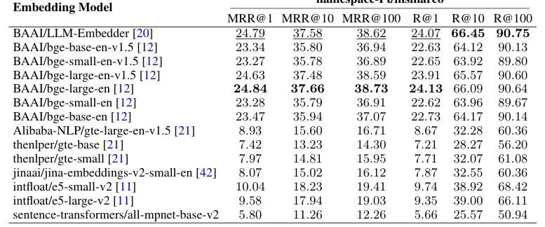 选择合适的嵌入模型对于有效的查询语义匹配和片段块非常关键。使用FlagEmbedding的评估模块,借助数据集namespace-Pt/msmarco和namespace-Pt/msmarco-corpus,选择适当的开源嵌入模型。如表所示,LLM-Embedder与BAAI/bge-large-en取得了可比的结果,尽管前者的尺寸是后者的三分之一。因此,选择LLM-Embedder以达到性能和尺寸的平衡。