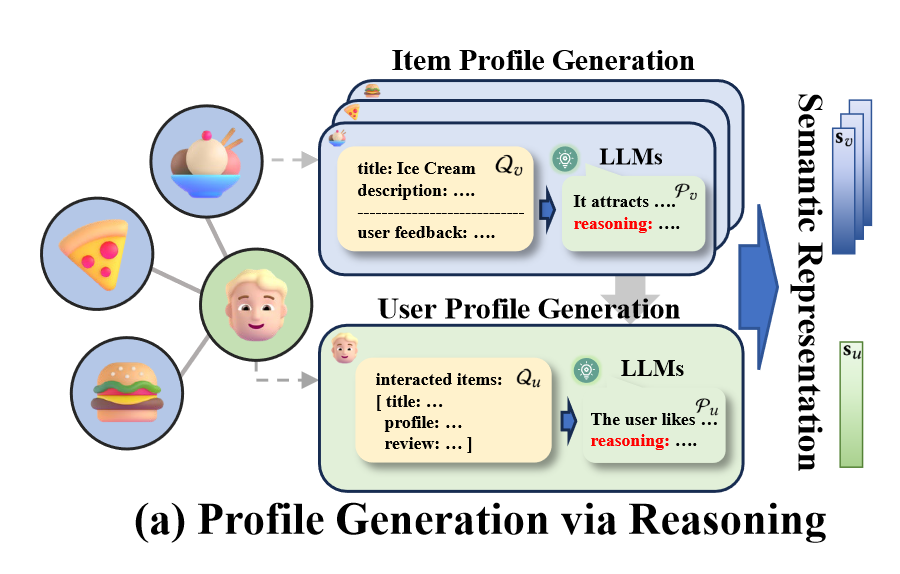 用户画像生成:借助用户与项目的交互记录,通过已经生成的项目画像来推断用户的偏好。具体来说,首先从用户交互的项目中抽样,然后将这些项目的文本属性和用户对这些项目的评论整合到一个特定格式的输入里面,让LLMs生成一个包含用户真实的偏好表达的用户画像。