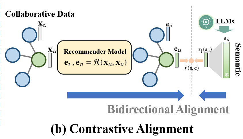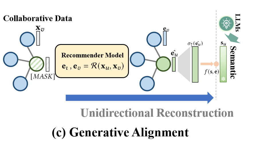 通过这种生成对齐机制,模型在协同表示的基础上融入了语义层面的信息,确保嵌入空间内的用户和项目表示在语义上保持一致性。