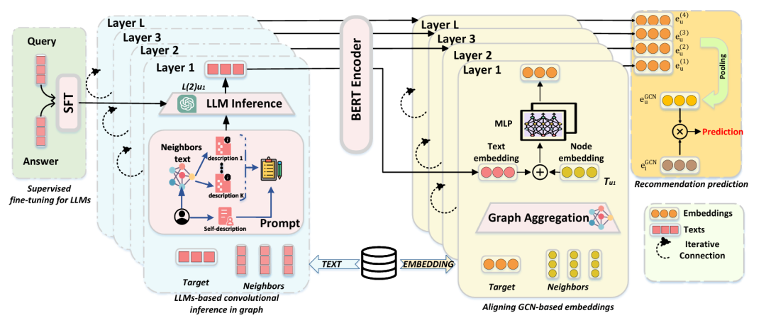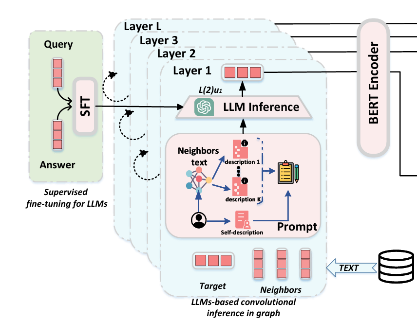 这一流程中的关键策略是逐层推理机制:每次仅聚合一阶邻居的文本描述,随着模型层数的增加,逐步捕获高阶邻居的信息。这种逐层推理不仅提高了计算效率,还使得LLM在生成用户描述时能够更有效地利用图结构信息,这是借鉴GCN提供的辅助优势之一。