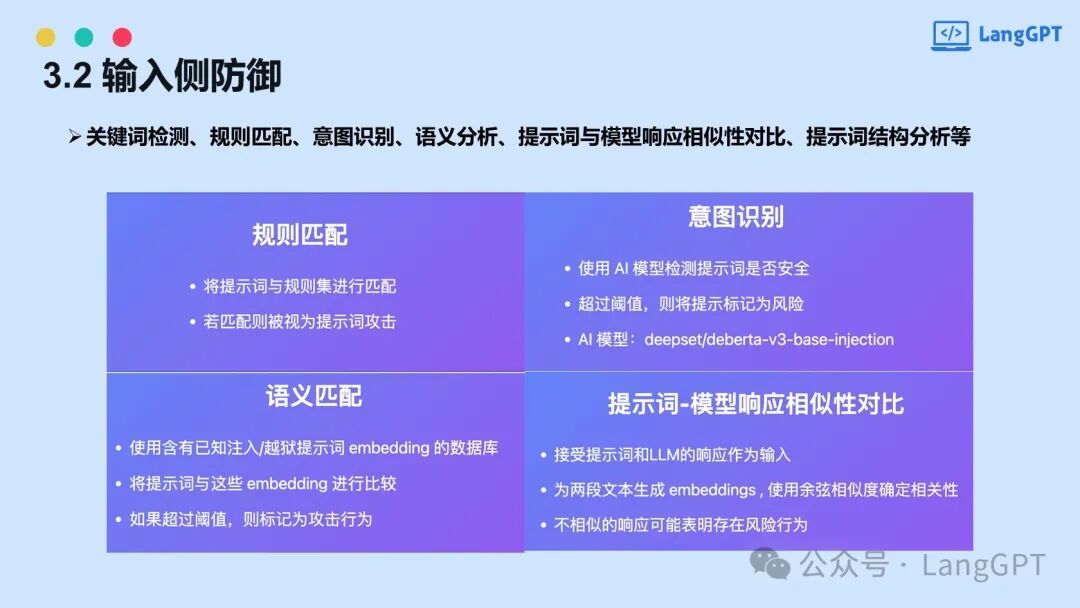 首先是输入侧的这样的一个防御,传统的这些防御手段都可以用上。结合大模型的这种特性,可以进一步的做意图的识别,语义的一些匹配。然后提示词跟你模型输入的这样一个响应,以及提示词语义的结构的这样的一些分析等等,来综合性的判断用户的输入是否是恶意的。