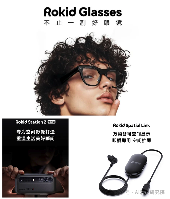 这次发布会发布了三个新品硬件:Rokid glasses、 Rokid Station 2(创作版)、Rokid Spatial Link。其中让消费者和媒体最哇塞的一定是Rokid glasses。