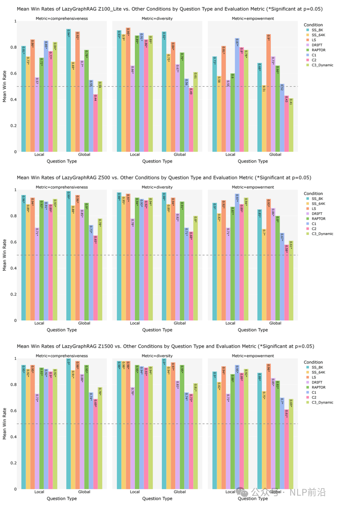 • 对于 GraphRAG 全局搜索的 4%查询成本,LazyGraphRAG 在本地和全局查询类型上,包括 C2 级别的 GraphRAG 全局搜索(大多数应用推荐的三级社区层次)上,显著优于所有竞争方法。