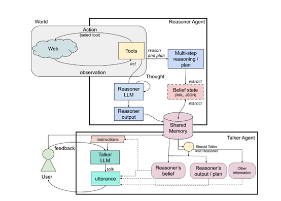 Talker-Reasoner架构的核心思想是将AI Agent分为两个独立的模块:Talker和Reasoner。这两个模块分别对应于人类的System 1和System 2,各自承担着不同的任务和功能。
