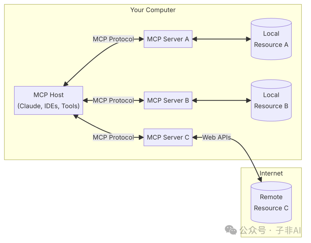 • Local/Remote Resources (资源):你的计算机资源(数据库,文件,服务)或者远程资源(例如通过 API),MCP 服务器可以安全地访问它们。