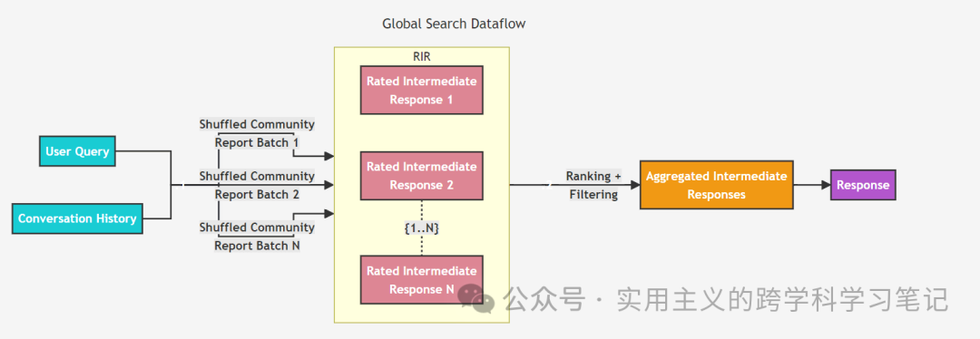 根据用户查询和可选的对话历史,全局搜索方法使用一系列来自图的社区层次结构中指定级别的社区报告作为上下文数据,以映射减少的方式生成响应。在map步骤中,将社区报告分割成预定义大小的文本块。然后,使用每个文本块生成一个包含一系列具有附带的数值评级的点的中级回应。在reduce步骤中,从中级回应中筛选出一组最重要的点,并将其聚合使用作为上下文来生成最终的响应。
