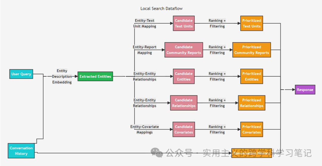 给定用户查询和可选的对话历史, 本地搜索方法从知识图谱中识别出与用户输入在语义上相关的一组实体。这些实体作为进入知识图谱的接入点, 能够提取更多相关细节, 如连接的实体、关系、实体协变量和社区报告。此外, 它还从与识别的实体相关的原始输入文档中提取相关文本块。然后对这些候选数据源进行优先排序和过滤, 以适应预定义大小的单一上下文窗口, 用于生成对用户查询的响应。
