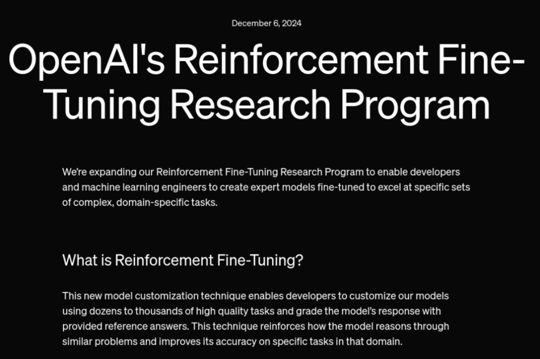 OpenAI 推出了一项新的模型定制计划——强化微调(Reinforcement Fine-Tuning),利用强化学习的强大能力,为特定任务打造专家级的AI模型。该计划旨在赋能开发者、研究人员和机器学习工程师,特别是在法律、金融、工程和保险等领域,通过他们自己的数据创建独特的AI解决方案。