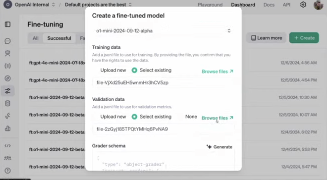 在 OpenAI 开发平台上提供了强化微调过程的分步演示,包括: 数据准备:上传 JSONLines 格式的训练和验证数据集,其中包含病例报告、症状、模型指令和正确答案。 评分器实现:定义一个评分器,根据正确答案对模型输出进行评估,评分范围为 0 到 1,并提供多种任务意图的评分器。 训练与评估:启动训练任务,利用 OpenAI 的基础设施和算法。微调模型显示验证奖励分数逐步上升,表明在任务上的泛化能力。 与基线模型比较:评估仪表盘结果展示了微调后的 Zero-one Mini 模型与基础 Zero-one Mini 和更大 Zero-one 模型的性能对比。微调模型在“Top at One”准确率上表现出显著提升。