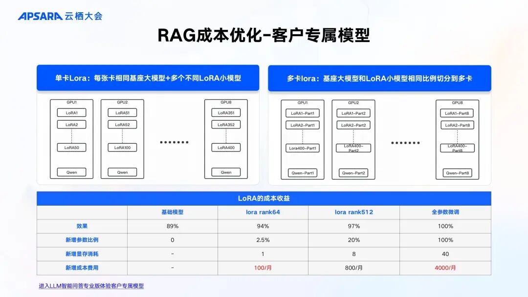 微调客户模型时,如果一个卡给一个客户,这个客户就需要独立承担这张卡的成本,但是我们如果把多个客户的模型微调放在一张卡上,就可以节约成本。我们现在把40到50个客户的模型微调放在一张卡上,把原来每个月4000的微调成本降低到每个月100,这样成本降低为原来的40分之1。