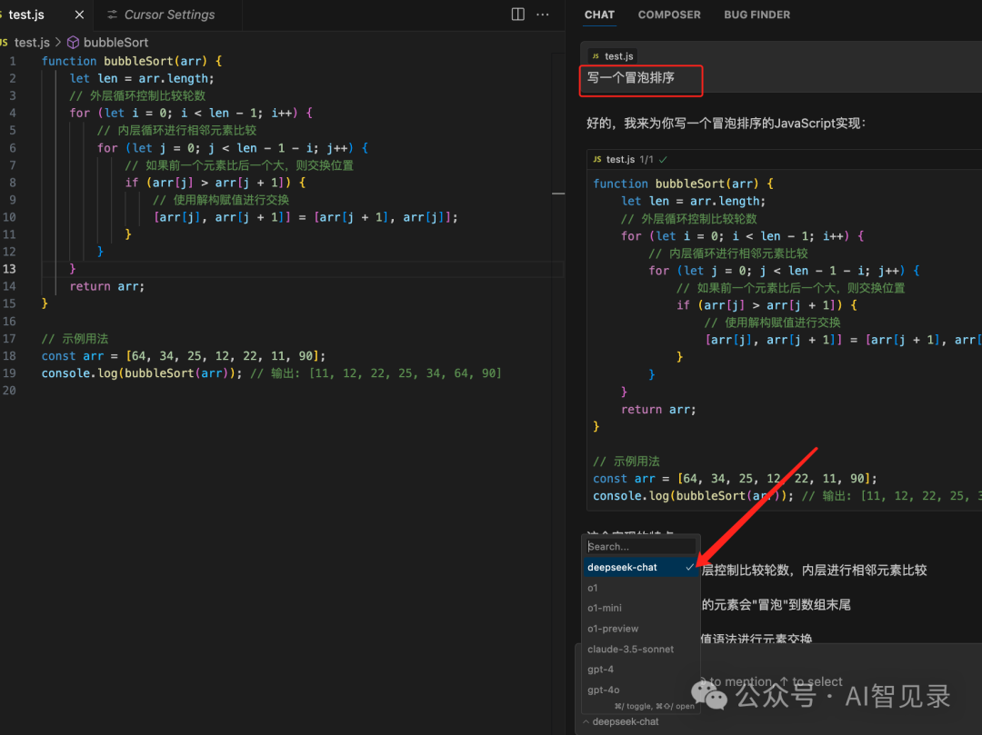 现在一切就绪,打开Cursor Chat窗口,选择模型'deepseek-chat',输入你的问题可以测试下,大家看如下结果,已经成功了。