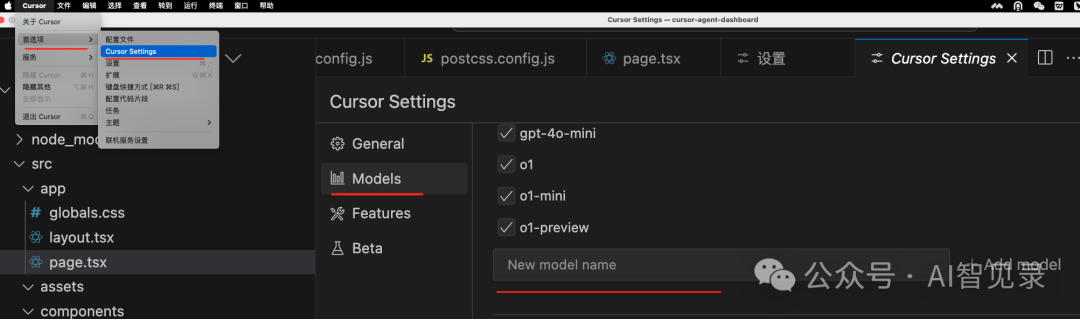第二步:在 Cursor Models 配置中添加模型和 API Key