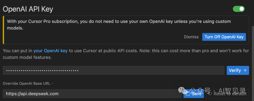 如果,买过 Cursor Pro 会员的小伙伴们会有如下提示,意思是已经升级为 Pro 模式了,就不用再配置自己的 OpenAI Key 了...