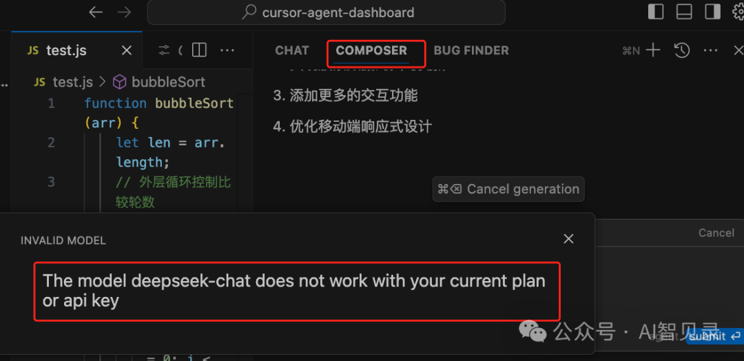 随后,我又切换到了 Cursor Composer 窗口,抱错如下,呀!这是不支持啊...,看来每月 20$ 还得花呀!