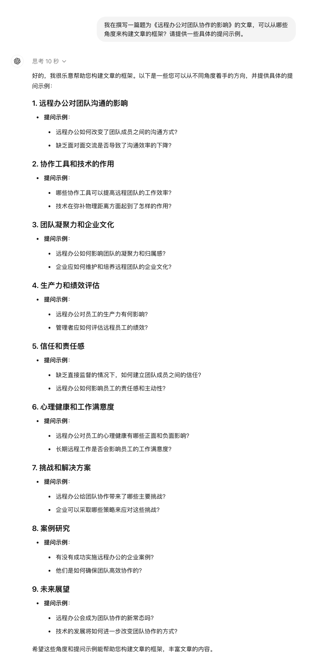 以下是在创作一篇题为《远程办公对团队协作的影响》的文章时,使用复合型提问的示例。