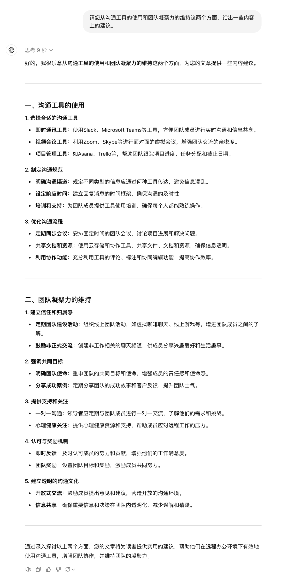 请您从沟通工具的使用和团队凝聚力的维持这两个方面,给出一些内容上的建议。