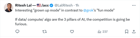 有趣的是,“成人模式”与Grok的“趣味模式”形成对比。如果数据、算力和算法是人工智能的三大支柱,那么竞争将会非常激烈。