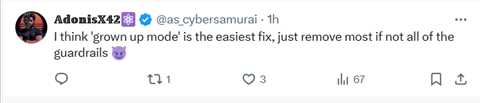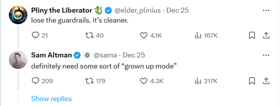 例如,这个已经确定的“成人模式”,就是由Pliny the Liberator网友提出来的,他希望可以让模型失去护栏,这样更简单干净。