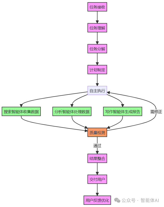 任务接收:用户提交任务需求,如“帮我写个市场分析报告”。 任务理解:规划模块分析用户输入,结合记忆模块中的用户偏好和历史数据,准确理解任务目标。 任务分解:将任务拆解为“数据收集”“趋势分析”“报告撰写”等子任务。 计划制定:为每个子任务制定执行计划,指定所需的工具和资源。 自主执行:多智能体系统启动,搜索智能体收集数据,分析智能体处理数据,写作智能体生成报告。 质量检测:系统实时监测执行质量,必要时进行自我修正。 结果整合:将各智能体的输出整合为一份完整的市场分析报告。 交付用户:向用户提供最终结果,并根据用户反馈进行优化。