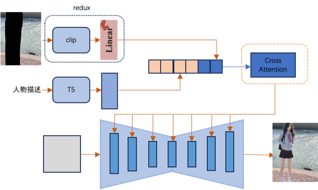 缺陷:redux 虽然已经可以得到较好的人物背景参考结果,但是由于其训练时未单独分离背景和人物,其生成的人物和原参考图相似度高,prompt 的人物控制能力下降,无法通过prompt 去自由改变人物细节。