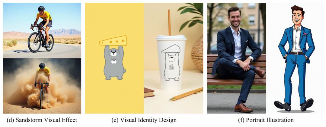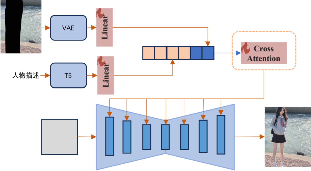 如下图所示,我们将背景特征VAE编码和线性投影后,直接和文本特征进行并联注入到DIT 中,尝试将背景图像细节特征直接映射到和txt 特征一样的语义层面,训练cross attention 层,让网络自适应学习图像背景控制和文本人物控制的融合,训练效果如下图,可以允许更自由的prompt 人物动作姿态控制,同时保持背景风格的一致性。
