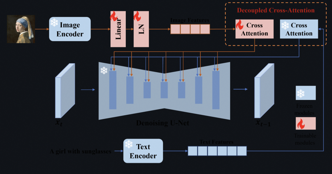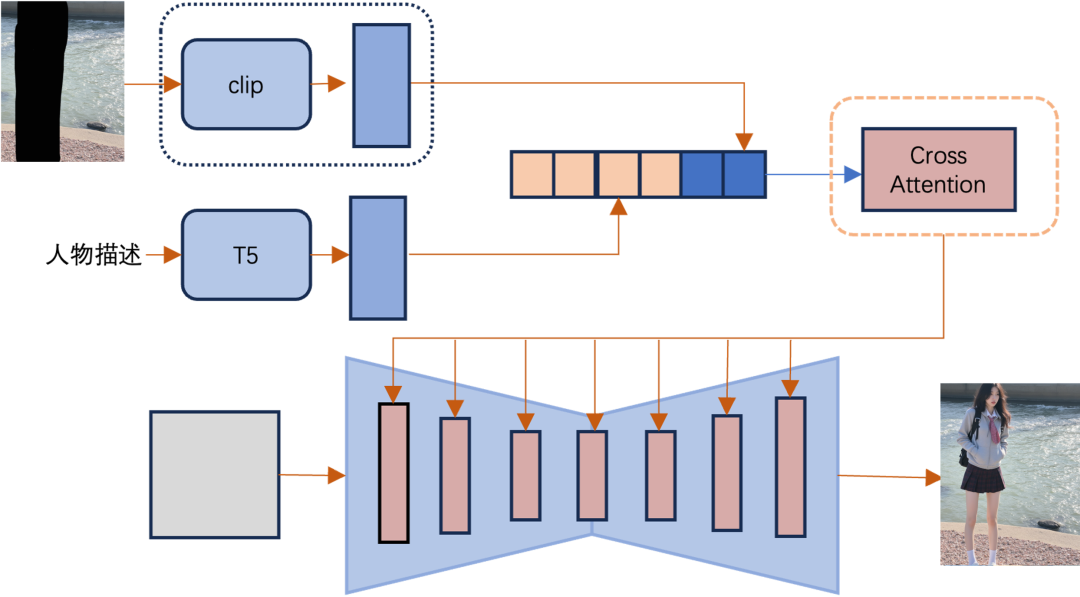 2. 此方案中人物通过prompt txt控制,而背景通过图像的clip特征控制,分别和latent特征进行cross attention再进行硬性权重叠加, 无法自适应学习人物支路和图像背景支路的融合特征。