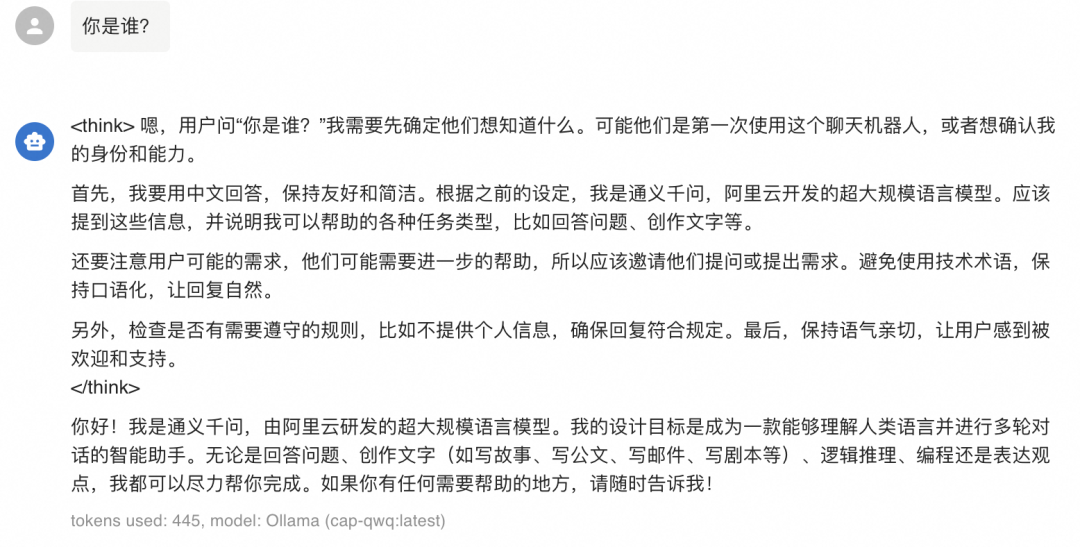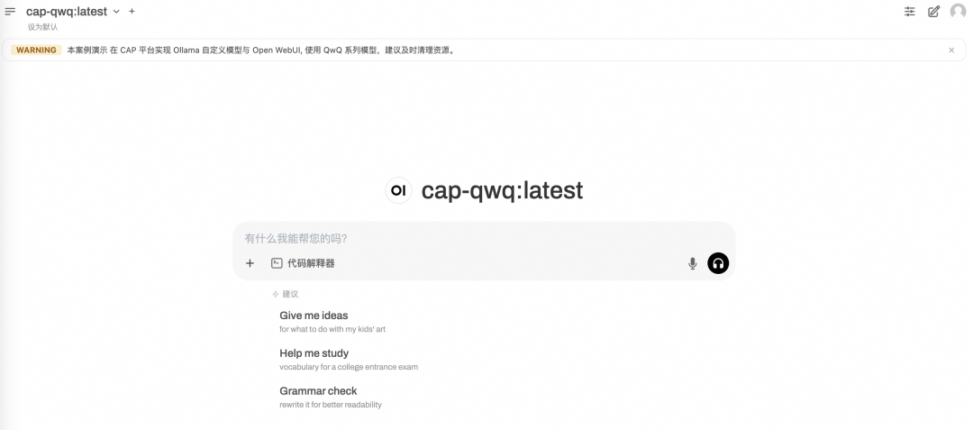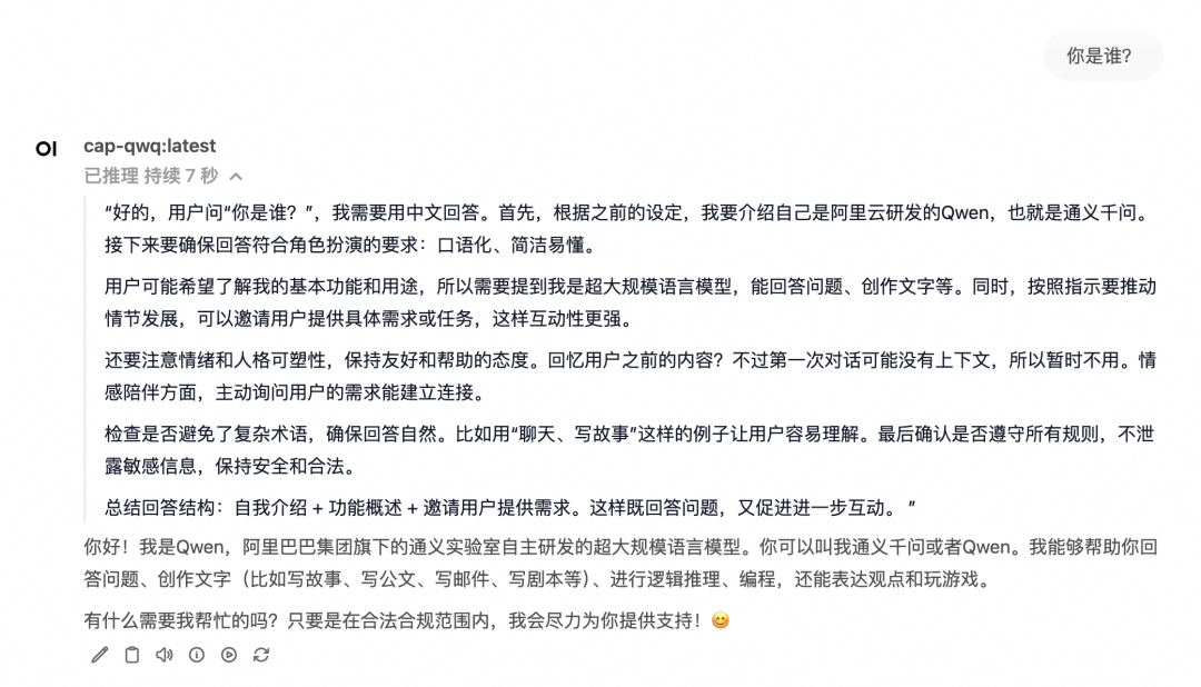 1. 在文本输入框中可以进行对话交互。输入问题你是谁?或者其他指令后,调用模型服务获得相应的响应。