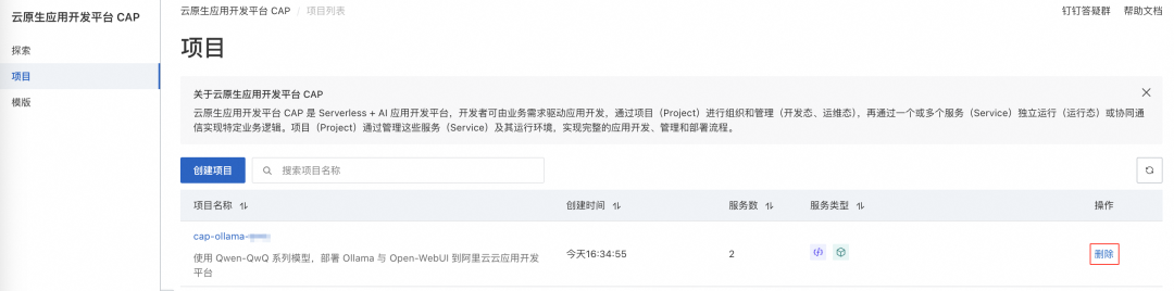登录云原生应用开发平台 CAP 控制台[7],在左侧导航栏,选择项目,找到部署的目标项目,在操作列单击删除,然后根据页面提示删除项目。