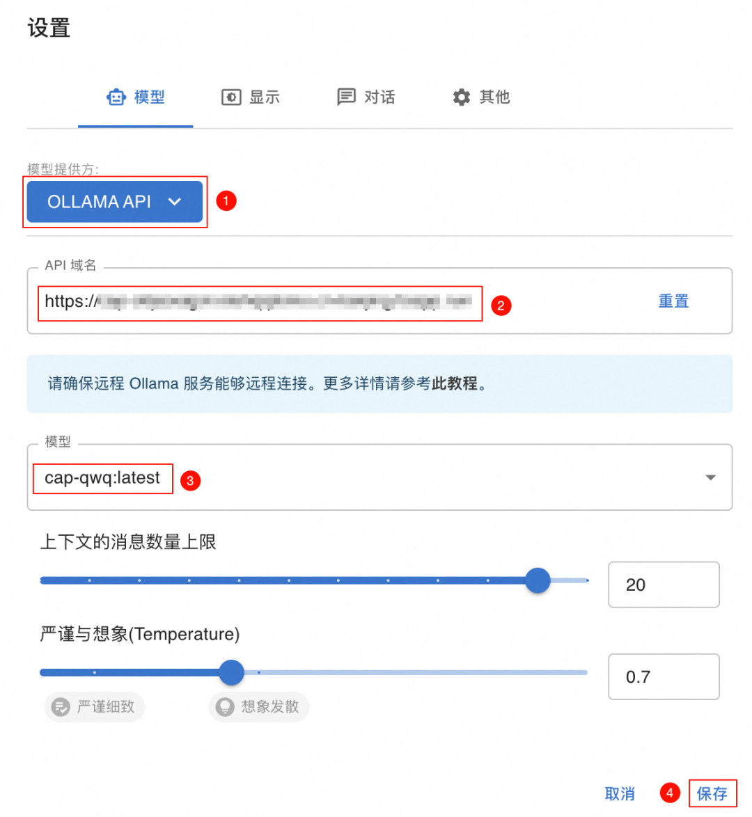 1. 下拉选择模型提供方Ollama API,填写API 域名(步骤 1 中获取的访问地址),下拉选择模型cap-qwq:latest,最后单击保存。
