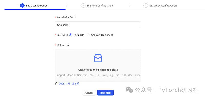 我们点击“Knowledge Management”知识管理。点击后,我们创建一个任务,命名你的知识任务,并选择本地文件,通过知识库管理页面上传所有支持类型文件后缀的文件创建知识库。