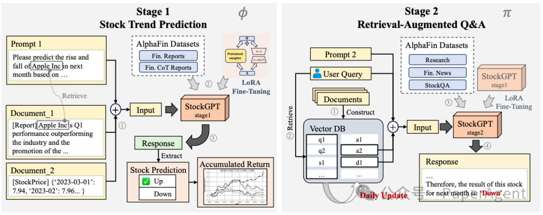 Stock-Chain结合了大型语言模型(LLMs)和检索增强生成(RAG)技术,以提高股票趋势预测和金融问题回答的准确性和可解释性: ingFang SC", "Microsoft YaHei", SimHei;font-size: 14px;letter-spacing: 0.5px;text-align: start;text-wrap: wrap;background-color: rgb(49, 49, 58);" class="list-paddingleft-1">问题定义:Stock-Chain将金融分析任务分为两个阶段:股票趋势预测和金融问答。在股票趋势预测阶段,目标是预测给定公司股票的涨跌趋势;在金融问答阶段,目标是基于用户查询、对话历史和相关文档提供回答。 数据集:Stock-Chain使用AlphaFin数据集进行训练和测试,该数据集包括传统研究数据集、实时金融数据、金融新闻和手工编写的思维链(CoT)数据。 StockGPT微调:通过两步微调过程,Stock-Chain训练了一个名为StockGPT的LLM,第一步使用AlphaFin的财务报告数据集进行训练,第二步使用手工创建的CoT数据集引导模型进行逐步思考。 预测和后处理:StockGPT用于预测股票的涨跌,并提供详细的分析和解释。预测结果经过后处理,选择所有预测为“上涨”的股票作为投资组合。 金融问答:Stock-Chain还具备金融问答能力,通过RAG技术增强LLMs的问答性能。这包括构建向量数据库、知识检索和响应生成。 金融分析中Stock-Chain框架两个阶段的示意图