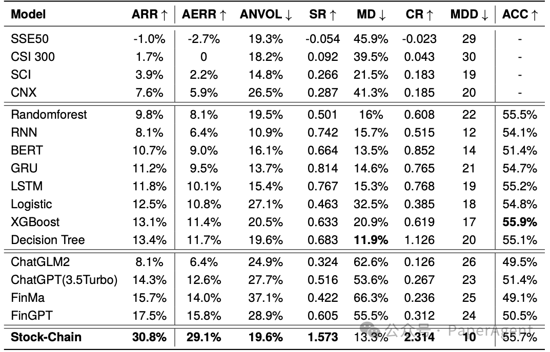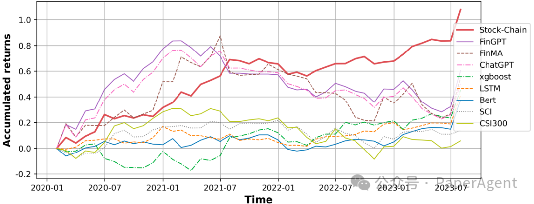 实验结果表明,Stock-Chain在股票趋势预测任务上实现了最先进的准确性,并且年度回报率(ARR)超过30%。此外,Stock-Chain在金融问答中也能提供全面的分析,增强了投资者的决策信心,并为他们的投资选择提供了坚实的基础。 2020年1月至2023年7月期间,金融报告数据集测试集中每个基线的累积回报率(AR)。该图表显示了一些基线的曲线。