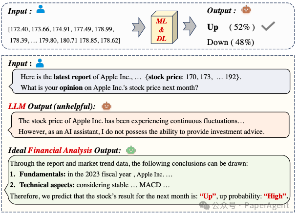 金融分析任务主要涵盖两个关键领域:股票趋势预测和相应的金融问题回答。目前,机器学习和深度学习算法(ML&DL)已广泛应用于股票趋势预测,取得了显著进展。然而,这些方法未能提供预测的理由,缺乏可解释性和推理过程。同时,它们也无法整合文本信息,如金融新闻或报告。与此同时,大型语言模型(LLMs)具有卓越的文本理解和生成能力。但由于金融训练数据集的稀缺和与实时知识的有限整合,LLMs仍然存在幻觉问题,无法跟上最新信息。金融分析任务的一个例子,包括股票趋势预测和金融问答。传统的机器学习与深度学习方法仅提供不确定的预测(上涨/下跌),没有任何理由说明,而原始的大型语言模型虽然能够提供预测分析,但却没有实际帮助。