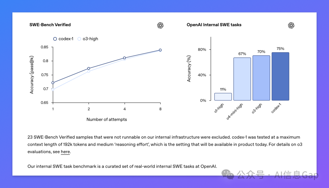 值得注意的是,上面的测试是在没有任何 AGENTS.md 文件或自定义环境配置的情况下进行的。此外,测试中的Codex-1使用了 192K 上下文长度和中等“推理强度”,这也是用户在产品环境中实际可用的配置。
