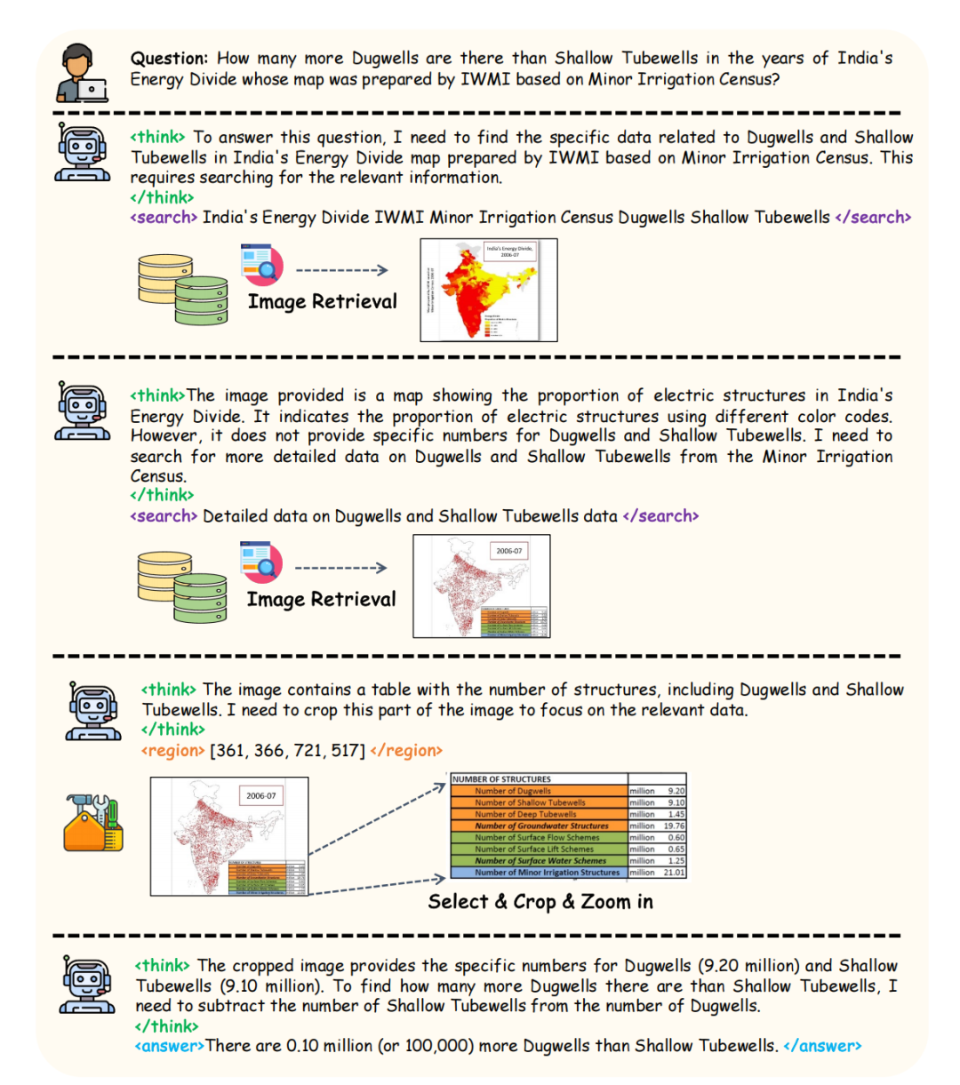 以上方法都是在思考过程中引入语义数据,而VRAG 能够让推理模型在思考时动态地引入图像等多种模态的数据。这意味着推理模型在处理问题时,可以综合利用来自不同模态的丰富信息,从而更加全面、深入地理解问题,并生成更加准确、丰富的回答。