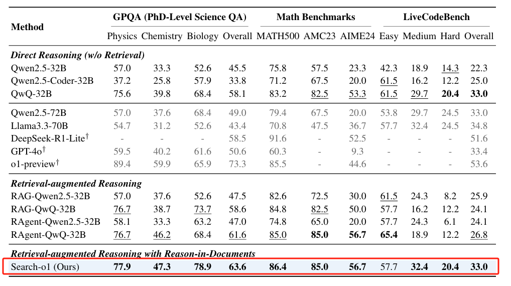 Search-o1 创新性地提出了一个框架,首次将代理检索增强生成(RAG)机制与大型推理模型(LRMs)的推理过程紧密集成,赋予模型自主补充知识的强大能力。在推理进程中,当LRMs遇到不确定的知识点时,Search-o1 能够自动触发检索操作,从外部知识源获取相关信息,扩展模型思维链。