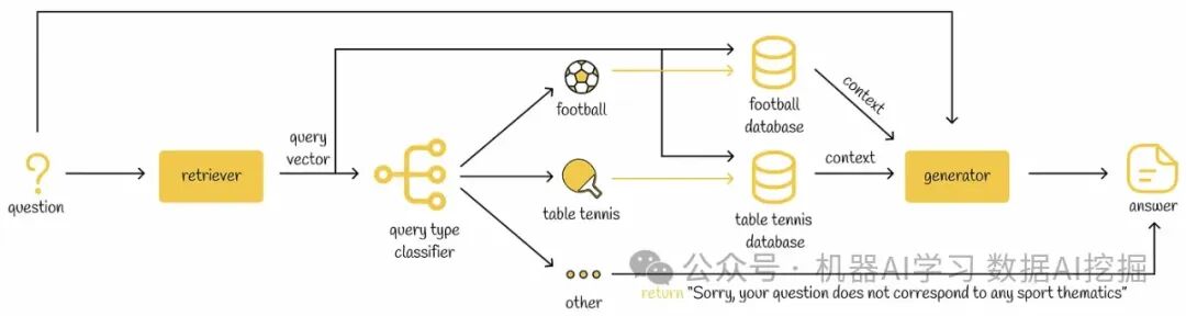 在某些情况下,如果一个LLM应用涉及多个知识领域,RAG检索器可以增加一个补充步骤,在该步骤中,它将尝试识别与给定查询最相关的知识领域。根据识别出的领域,检索器随后可以执行不同的操作。例如,可以使用几个各自对应特定领域的向量数据库。当查询属于某个特定领域时,该领域的向量数据库随后被用来检索与查询最相关的信息。