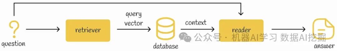 通过检索与查询向量最相似的k个数据库向量,它们原始的文本表示被用来通过另一个称为阅读器的组件来查找答案。阅读器接收一个初始问题,并对每个检索到的k个文档,它在文本段落中提取答案并返回这个答案正确的概率。然后,具有最高概率的答案最终从抽取式问答系统中返回。