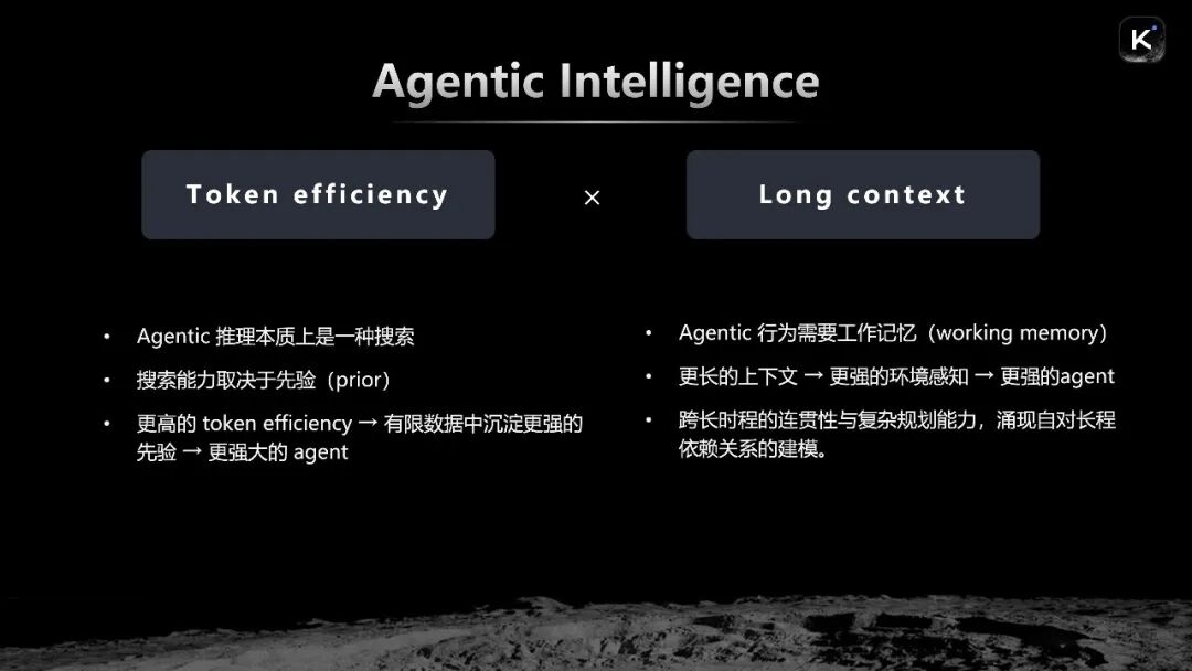要提升Agentic智能,就必须能够完成复杂的长程任务。2025年,月之暗面的两个技术进化的主线就是提升“Token Efficiency”,以在有限的数据下冲击更高的智能上限;以及扩展“长上下文”(Long Context)能力,以满足Agentic时代越来越长程的任务对模型的记忆能力需求。