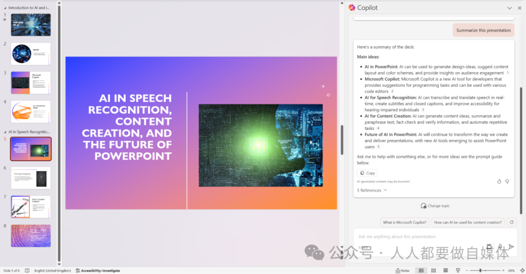 公式是 Excel 的一部分,Copilot 可以在你点击聊天输入顶部的提示气泡时建议一些升级。一定要查看这些气泡,因为它们可以帮助你理解在选择新数据范围时有什么可能性。例如,“显示数据洞察”会快速总结当前范围内有什么独特或重要的信息。 最后,你可以通过与 AI 聊天来转换数据或格式。你可以添加新行和新值,或将第一列加粗,以帮助你更好地浏览表格中的信息。 PowerPoint 中的 CopilotPowerPoint也有一些 AI 改进。如果你的团队分享了很多幻灯片,打开 Copilot 侧边栏并请其总结演示文稿。你将获得一小段主要主题,而无需仔细逐页翻看。