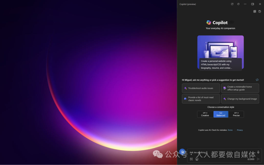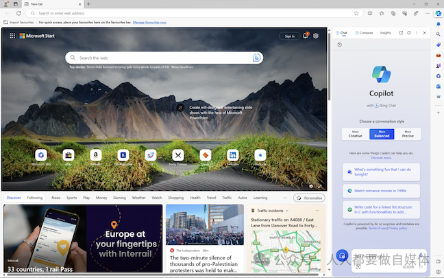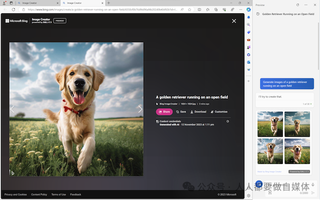 在 Microsoft Edge 浏览器访问 Copilot 的视图 在 ChatGPT 发布后,Microsoft 迅速将 AI 集成到 Bing 搜索中,这是一种搜索互联网和生成基于结果的自然语言响应的聊天体验。其最令人兴奋的更新就是与 DALL·E 3 的整合,后者是 OpenAI 的图像生成模型。