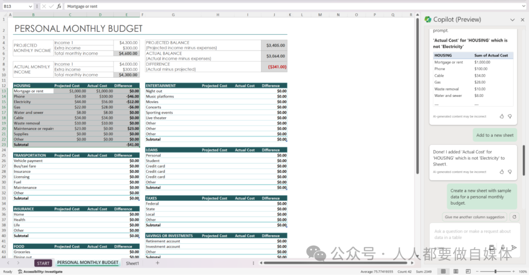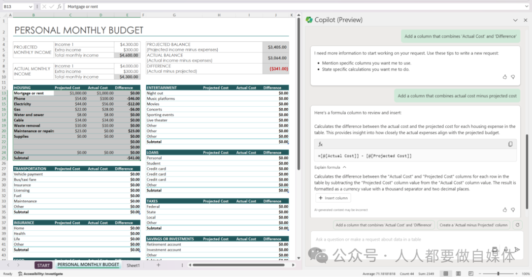 完成写作后,或许在阅读他人所写的文档后,你可以点击右上角的 Copilot 按钮打开侧边栏聊天。在这里你可以询问与文档相关的问题、总结内容,或以任何你想要的方式分析文本。确保单击输入字段中的书本图标:你将找到适合常见任务的多种提示集合。 总的来说,比在 ChatGPT 和你的写作软件之间进行复制和粘贴要愉快得多,对吧? Excel 中的 Copilot接下来是对数据敏感的人,Excel中的魔力依旧。像 Word 一样,你可以通过单击 Copilot 按钮打开侧边栏聊天。我从网上下载了个人预算模板,并开始提示,看它能做些什么。