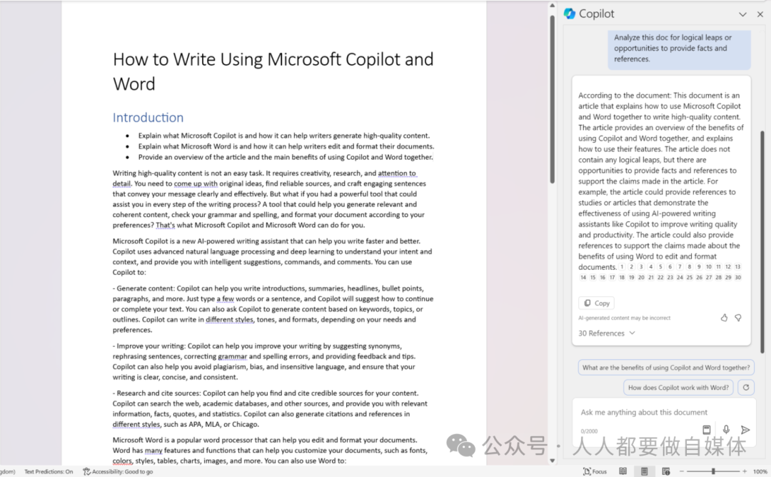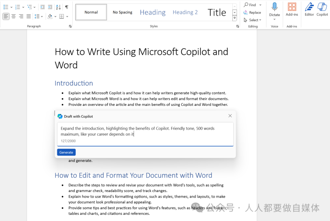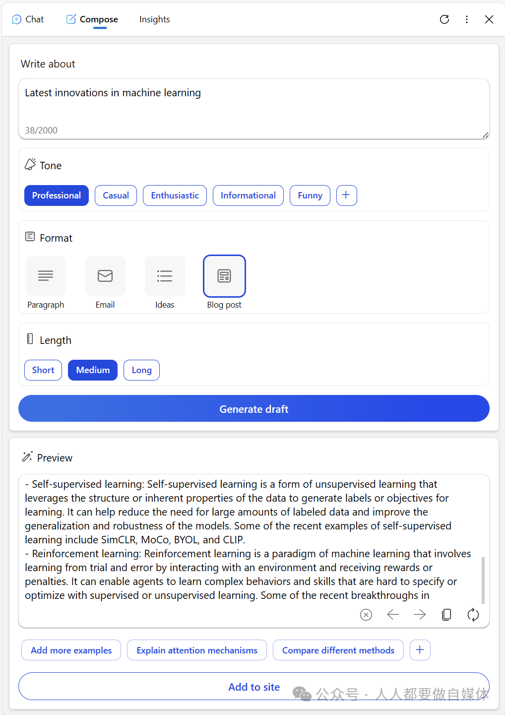 获取输出后,你可以将响应粘贴到你打开的任何网站中:只需单击添加到网站按钮。此功能是将 AI 生成的文本粘贴到新的 Gmail 邮件、新的 WordPress 帖子或网页上任何输入字段的有用快捷方式。 如何在 Word、Excel 和 PowerPoint 中使用 Microsoft Copilot现在,您可以使用 AI 在 Word 中写作,在 Excel 中分析数据,以及在 PowerPoint 中生成演示文稿,只需通过提示:只需在每个应用的工具栏右上角查找 Copilot 图标。 Word 中的 Copilot从Word开始,使用 ALT + i 快捷键在空白文档中输入新提示。我请求提供一篇关于如何在 Word 中使用 Copilot 进行写作的文章大纲(如此自我反省):结果完全格式化并插入到文档中,准备进行编辑。你可以选择保留或舍弃结果,并选择是否生成新的内容或仅使用简短提示。