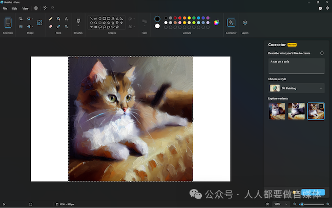 如果你需要配音但自己录音不便,那里还有一个文本转语音功能,提供了一系列的声调控制。这种结果不错,是在时间紧迫时寻求其他选项的良好选择。 Copilot 在画图中如果你在 90 年代长大,我相信你记得画图。它正在通过 Cocreator 功能回归,这是一种 AI 图像生成工具:从你的提示开始,从下拉菜单中选择样式,结果会粘贴到画布上,随时准备编辑。它还可以模糊图像的背景,这是与照片共享的一项功能。