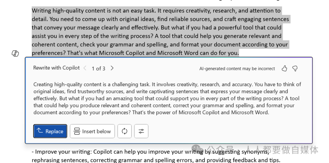 不确定这段文字是否能够引起读者共鸣?选中它并选择使用 Copilot 重写:会出现三个新的选项,由你来决定哪个是原始文本的最佳改写。