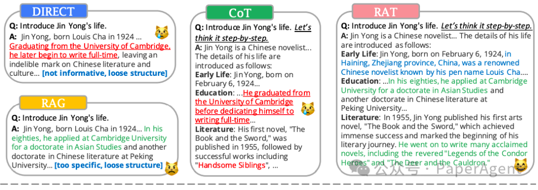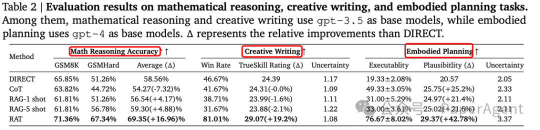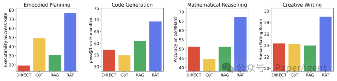 不同大型语言模型(LLM)在创意生成任务中的推理方法示例。红色文本表示LLM生成文本中的错误或幻觉,而绿色文本代表正确的生成。没有使用RAG的方法通常会产生带有幻觉的错误信息,传统的RAG与检索到的内容高度相关但结构松散,而RAT生成的文本在准确性和完整性方面表现最佳。  将RAT应用于GPT-3.5、GPT-4和CodeLLaMA-7b等模型,在代码生成、数学推理、创意写作和具身任务规划等各种长期生成任务上显著提高了性能。例如,在代码生成任务中,RAT相对于直接方法(DIRECT)的平均评分提高了13.63%,在数学推理任务中提高了16.96%,在创意写作任务中提高了19.2%,在具身任务规划中提高了42.78%。不同LLM推理方法在复杂具身规划、数学推理、代码生成和创意生成任务上的定量性能比较。RAT在所有任务上都超越了所有基线方法。