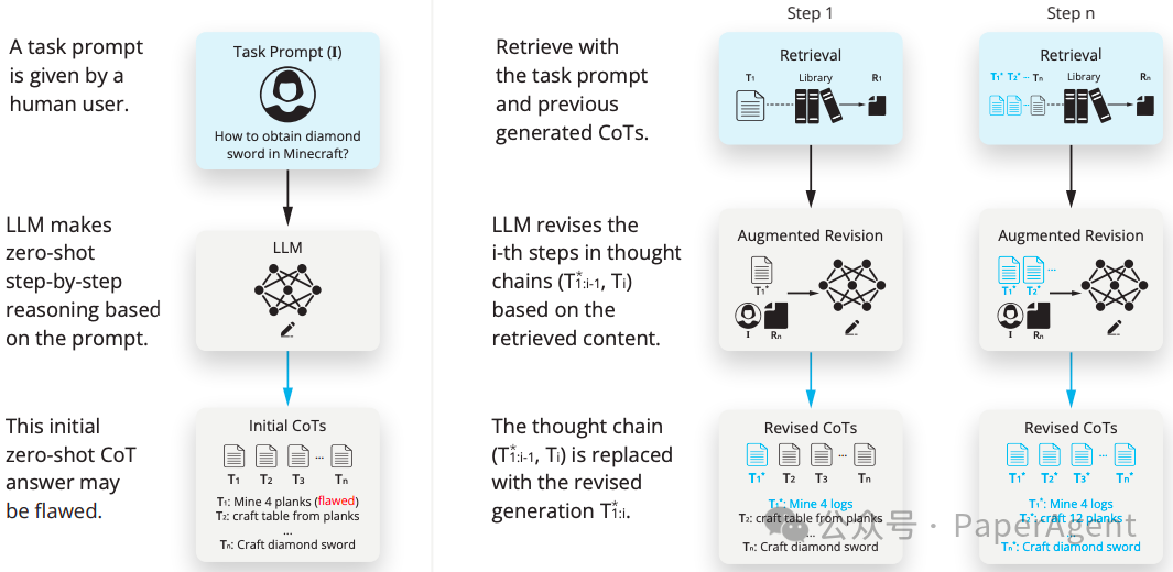 检索增强思维(Retrieval Augmented Thoughts, RAT)通过迭代修订思维链来显著提高大型语言模型(LLMs)在长期生成任务(代码生成、数学推理、创意写作和具身任务规划等)中的推理和生成能力,同时大幅减轻幻觉现象。RAT方法通过检索与任务查询、当前和过去思维步骤相关的信息来逐个修订每个思维步骤,从而在初始零次CoT(链式思维)生成后进行修订。 检索增强思维(RAT)流程。给定一个任务提示(图中表示为I),RAT从LLM生成的初始逐步思考(T1, T2, ..., Tn)开始进行zero-shot(“让我们一步步思考”)。一些思考步骤(如图中的T1)可能因幻觉而存在缺陷。RAT使用来自外部知识库(表示为图书馆)的RAG迭代修订每个思考步骤(T★1, T★2, ..., T★i-1, Ti)。