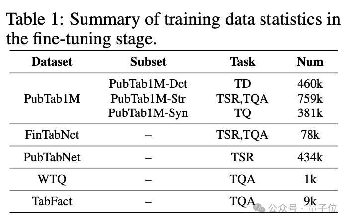 数据方面,TabPedia的全部数据来源于五个公开的表格数据集,包括PubTab1M、FinTabNet、 PubTabNet、WikiTableQuestions(WTQ)和TabFact,具体的数据使用情况如下图所示: