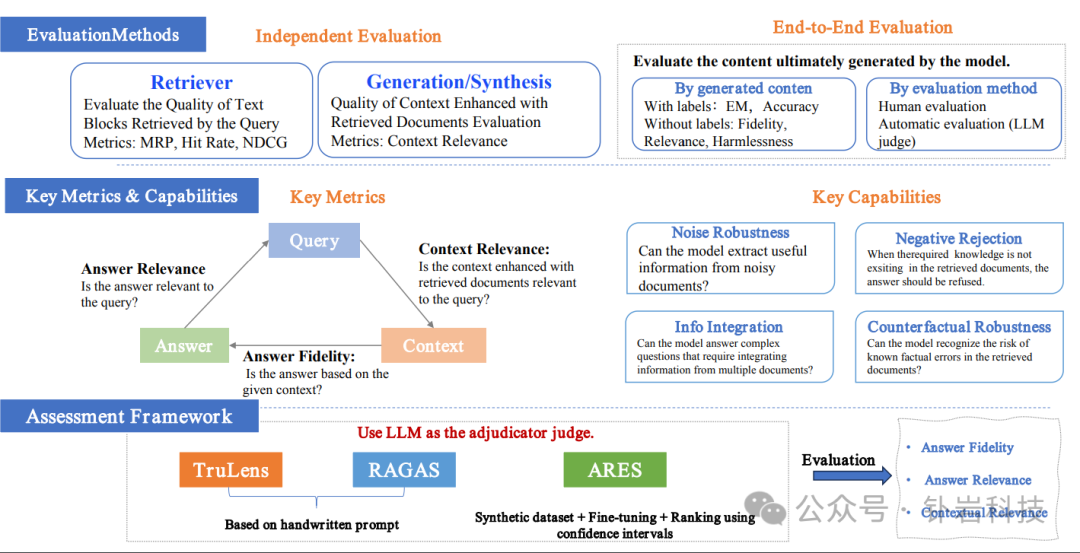 具体来说,评估方法主要围绕其两个关键组件:检索(Retrieval)和生成(Generation)。评估这些组件的性能涉及到多个质量分数和能力,这些分数和能力共同反映了 RAG 模型在信息检索和生成过程中的效率。