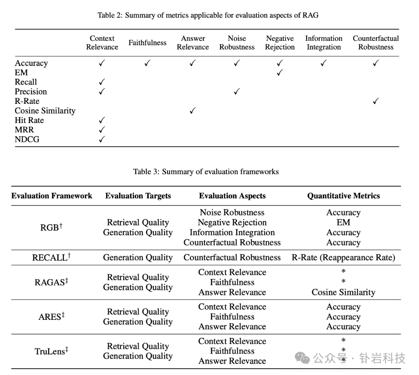 • 评估框架方面,有 RGB、RECALL 等基准指标,以及 RAGAS、ARES、TruLens 等自动化评估工具,可以较全面地衡量 RAG 模型的性能。